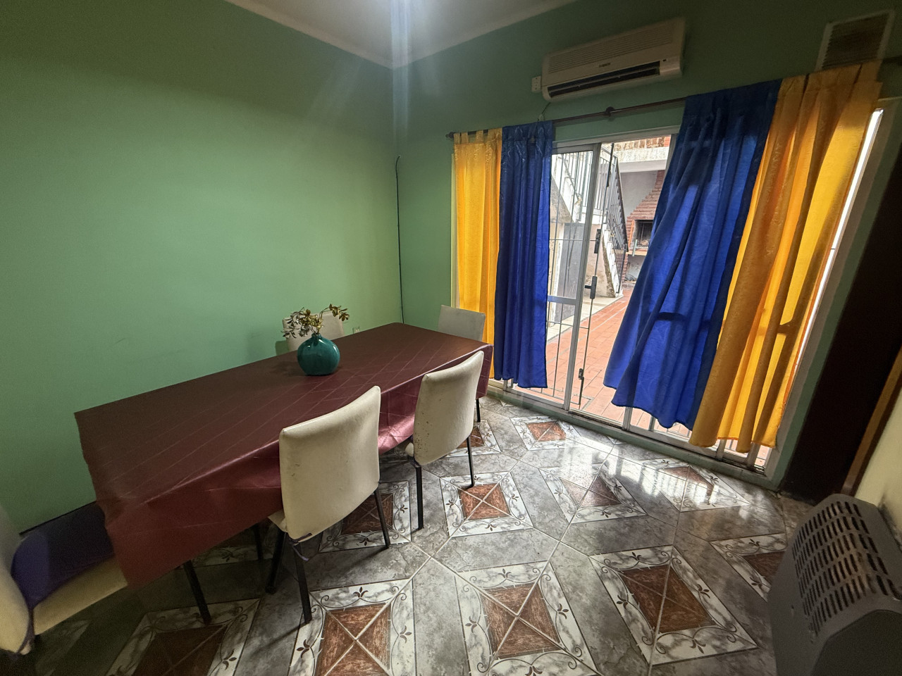 Al ingresar, encontramos un living-comedor luminoso, equipado con ventana al frente y hogar a leña, ideal para calefaccionar y crear un ambiente acogedor. Luego, a través del living, accedemos a la cocina amoblada, que cuenta con mesada, bajo mesada y alacena.