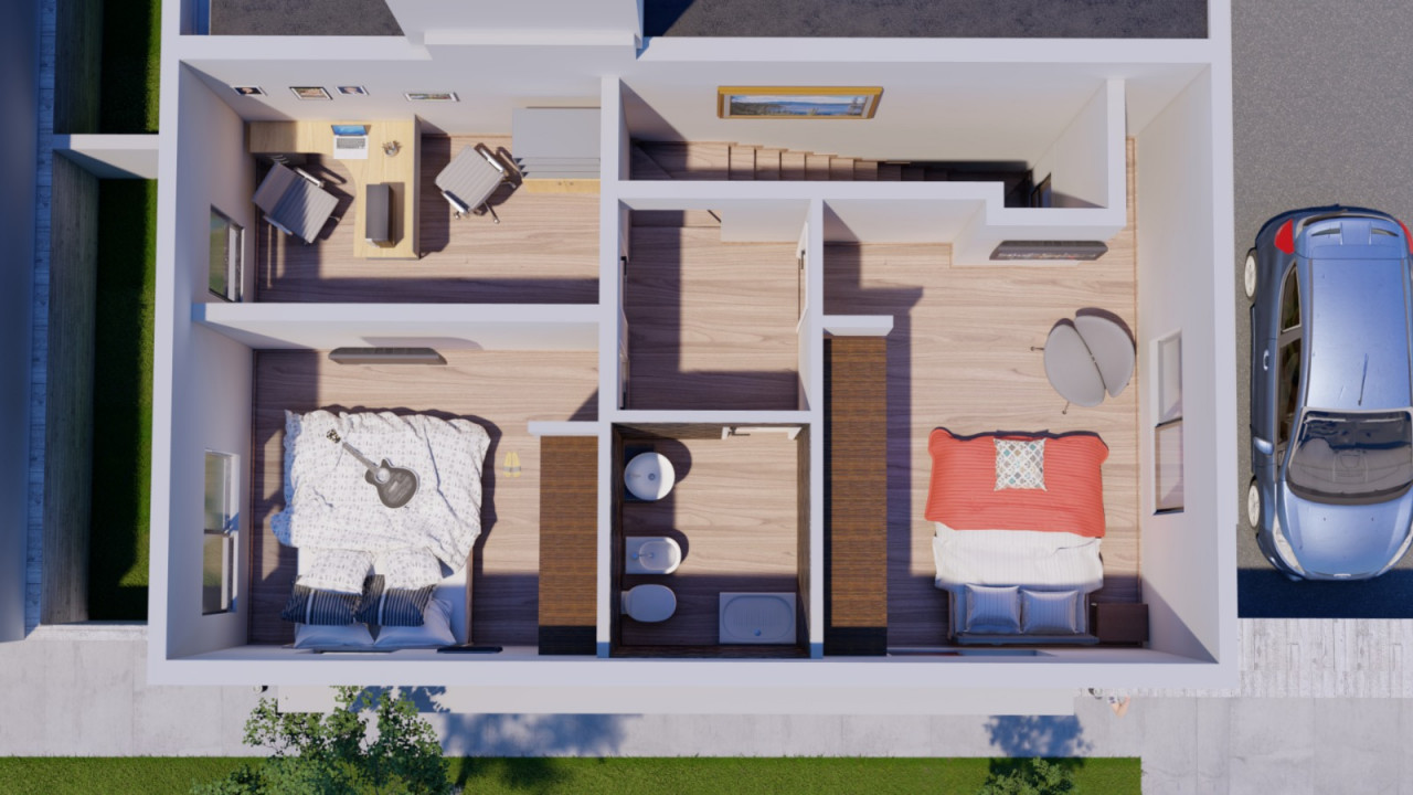 Planta alta: dos dormitorios, un escritorio y un baño completo.