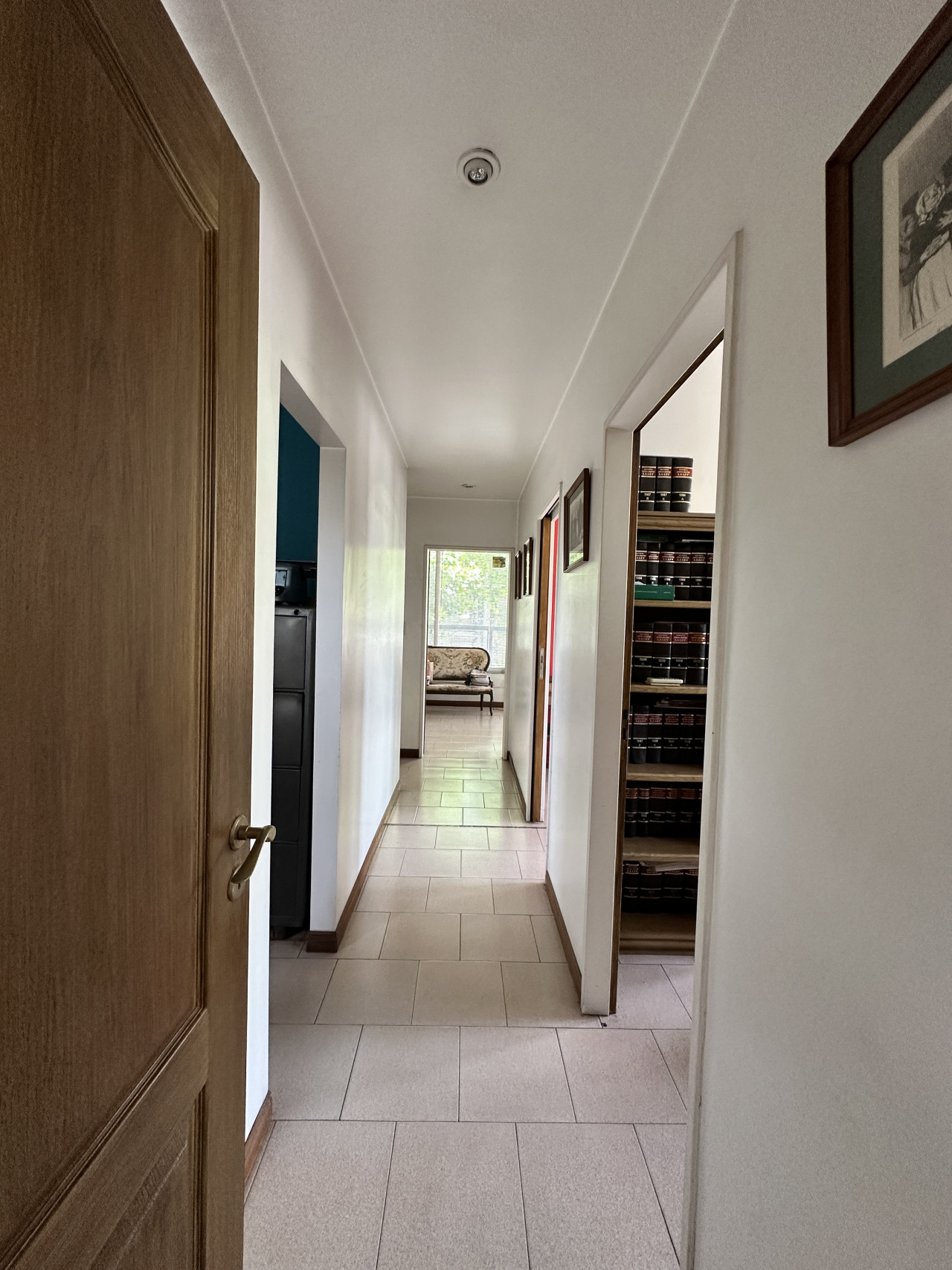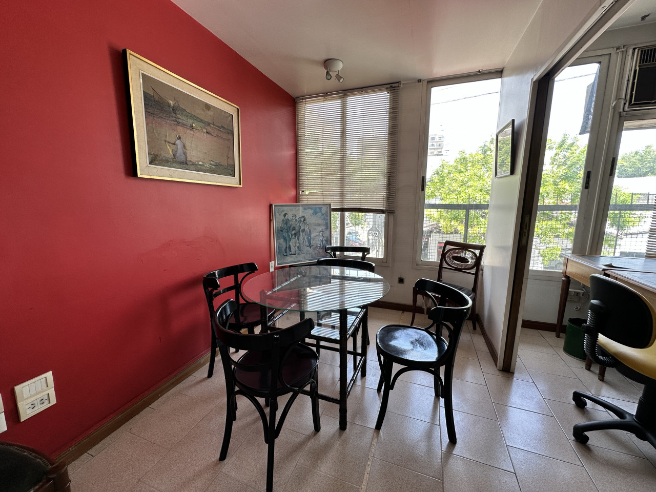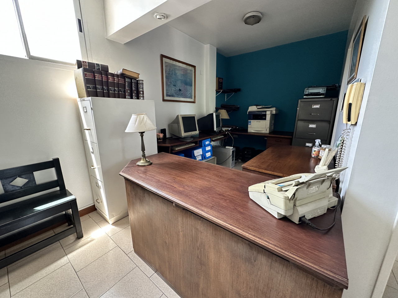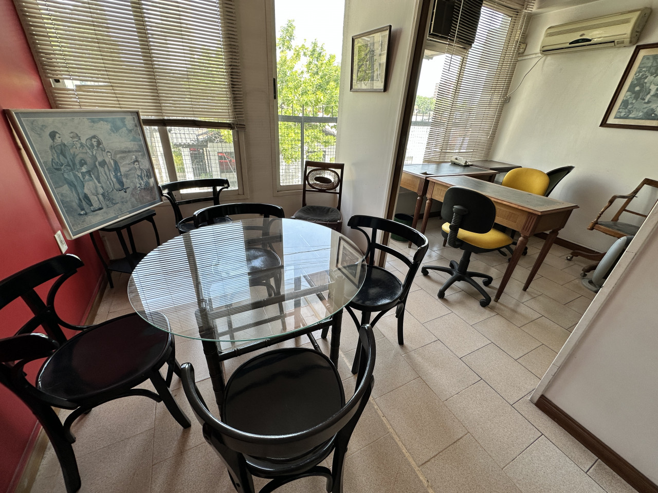El inmueble está en un primer piso por escalera y cuenta con timbre eléctrico y alarma. Al ingresar, hay un amplio ambiente ideal para recepción y sala de espera, donde también se encuentra la primera oficina con aire acondicionado, ventanas y vidrieras.