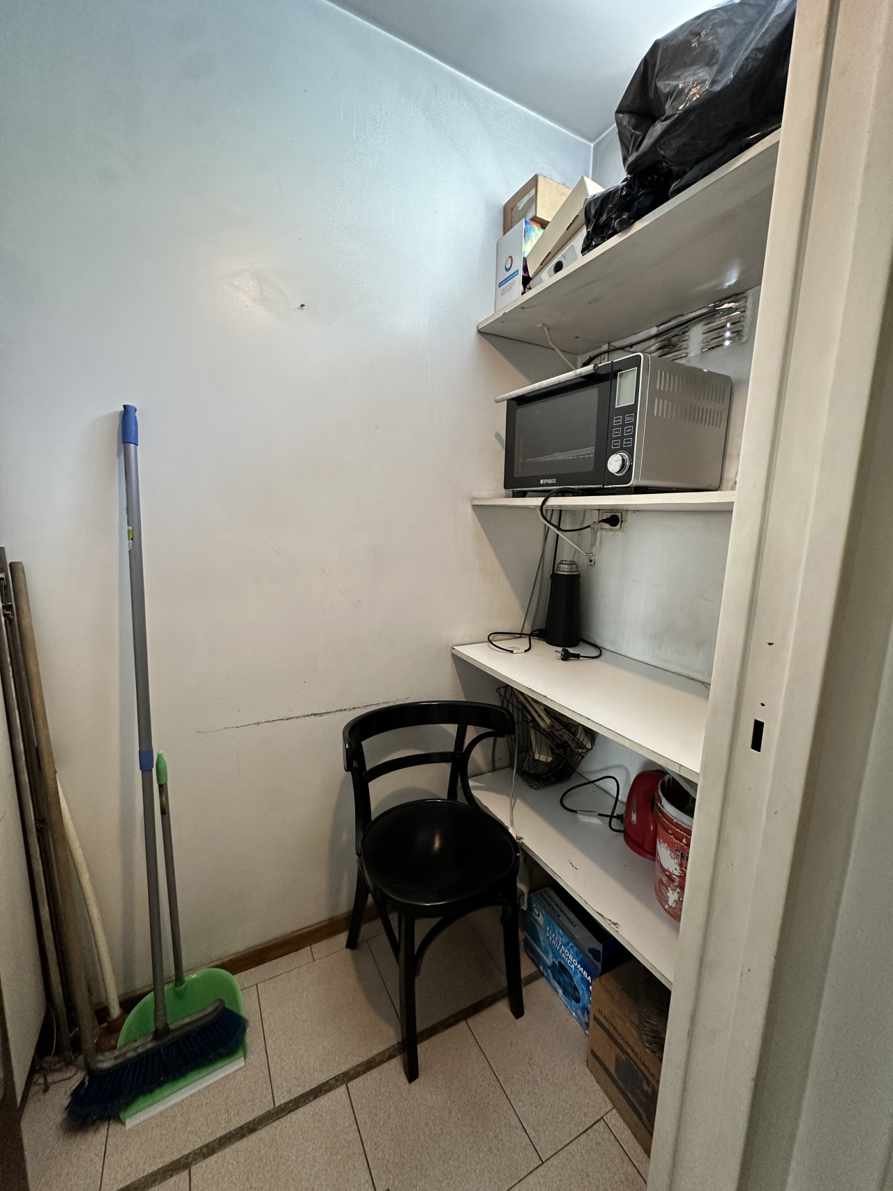 Desde una puerta que da al pasillo se accede al resto de las oficinas: dos de ellas comunicadas entre sí (con opción de cerrarlas), con aire acondicionado y luces regulables. Más adelante, a la izquierda, hay un espacio de guardado, un kitchenet, un antebaño con lavamanos y una canilla baja, y finalmente el toilette. Al final del pasillo se ubica la oficina principal, rodeada por ventanales que aportan luz natural todo el día.